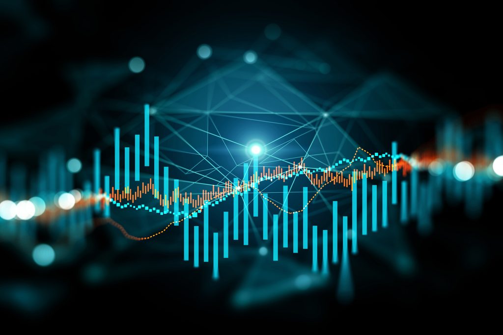 ← → Financial forex chart analyzing. Graph reflects market deviation over historic period. Volatility concept. 3d rendering